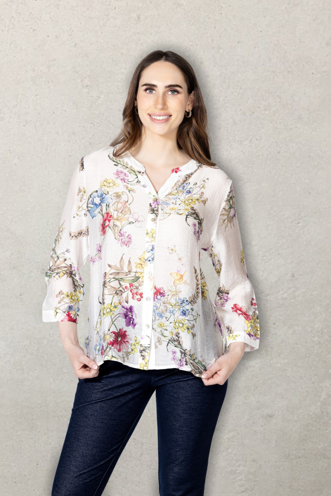 Artistic and elegant, this V-neck blouse features a beautiful botanical sketch print with watercolor accents. Crafted from a luxurious viscose-nylon blend, this piece drapes beautifully and offers exceptional comfort with a sophisticated, flowing silhouette.