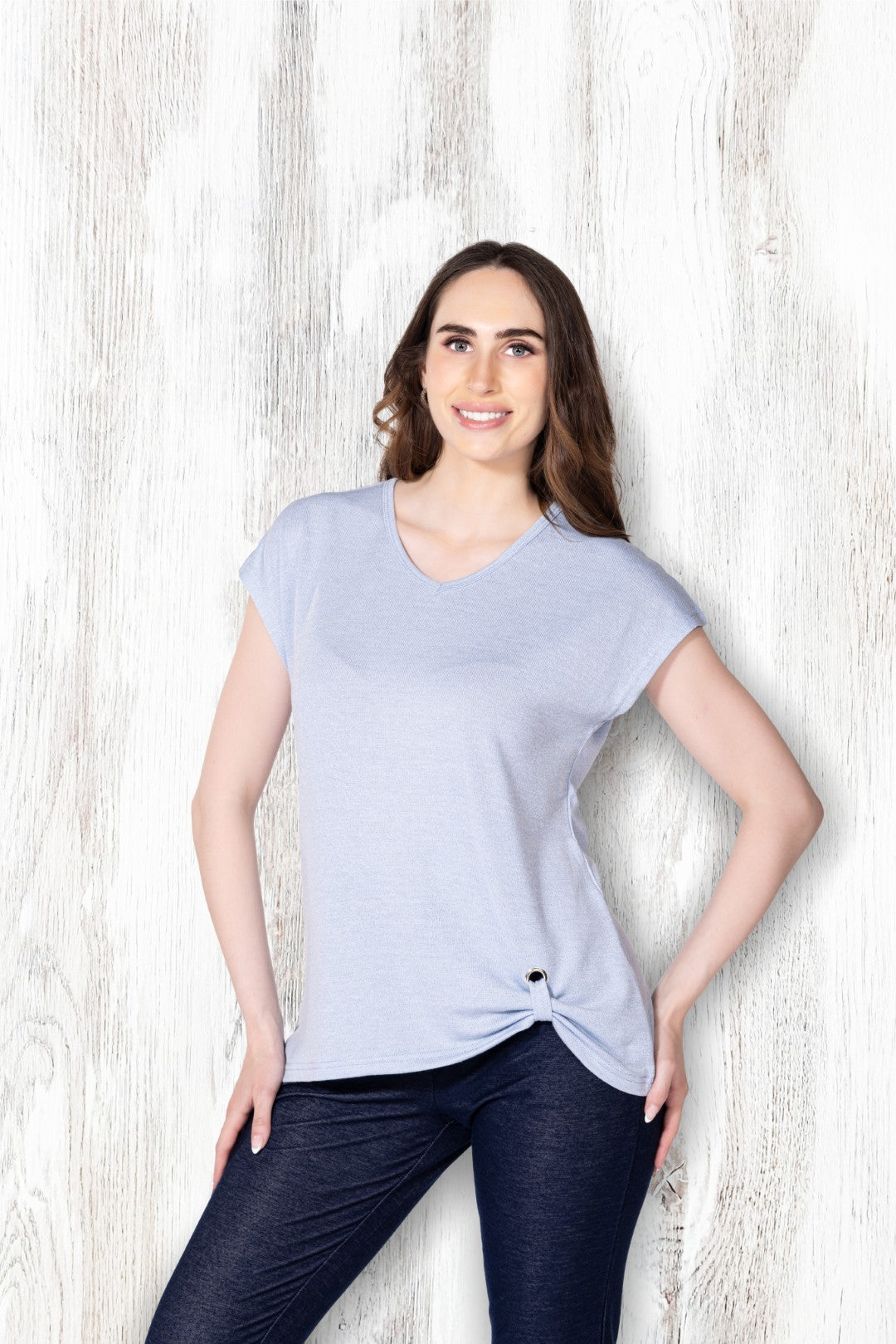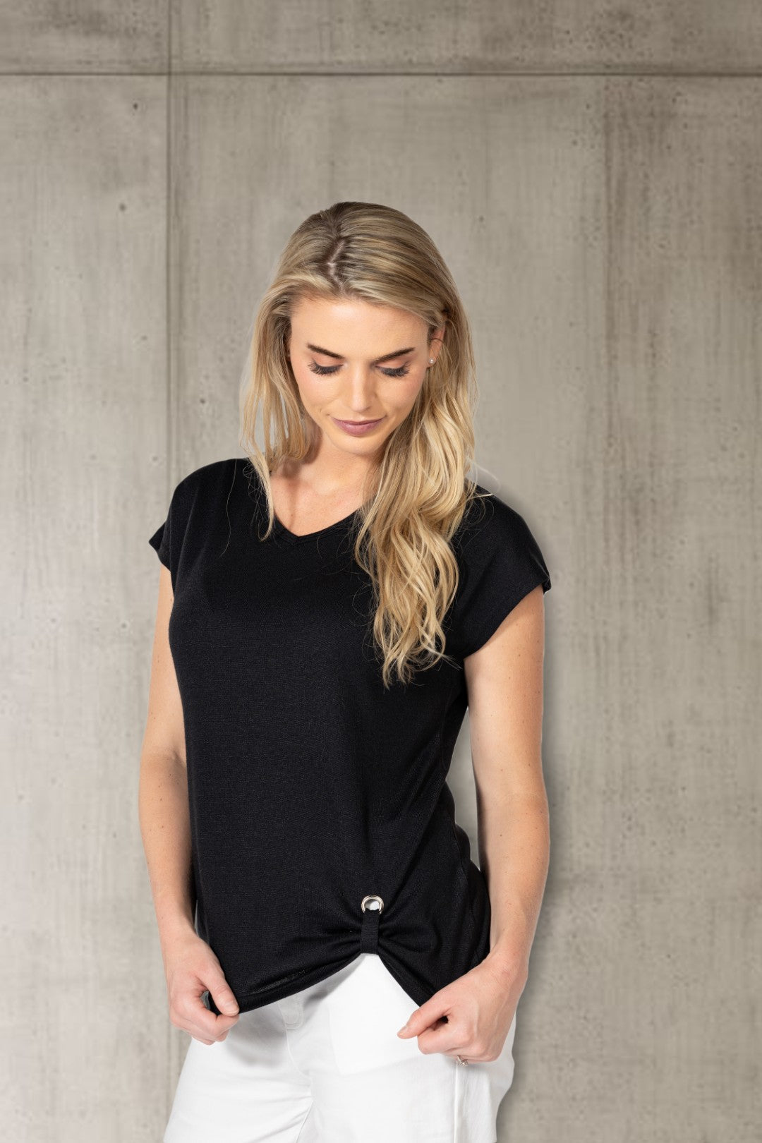 Sleek and sophisticated V-neck top featuring a distinctive buckle accent at the hem. Crafted from a stretch poly-blend fabric that moves with you, this piece offers a flattering fit and modern silhouette perfect for both professional and casual settings.